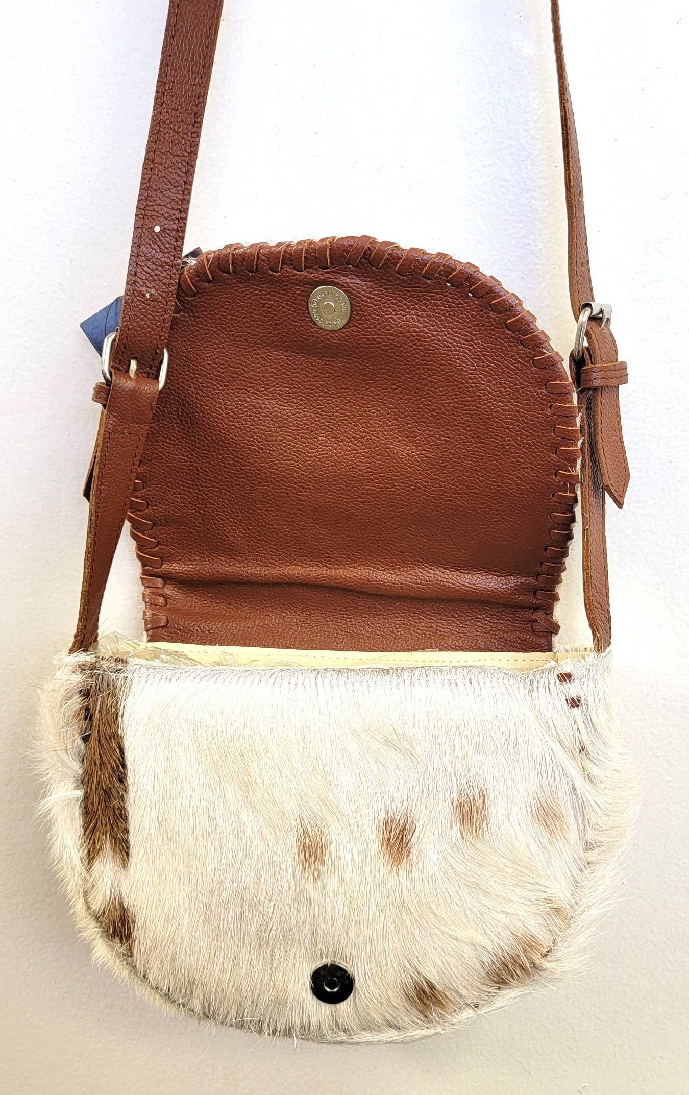 GENUINE HAIRON LEATHER, BEADED FLAPOVER CONDUCTOR BAG WITH CROSSBODY WOVEN STRAP