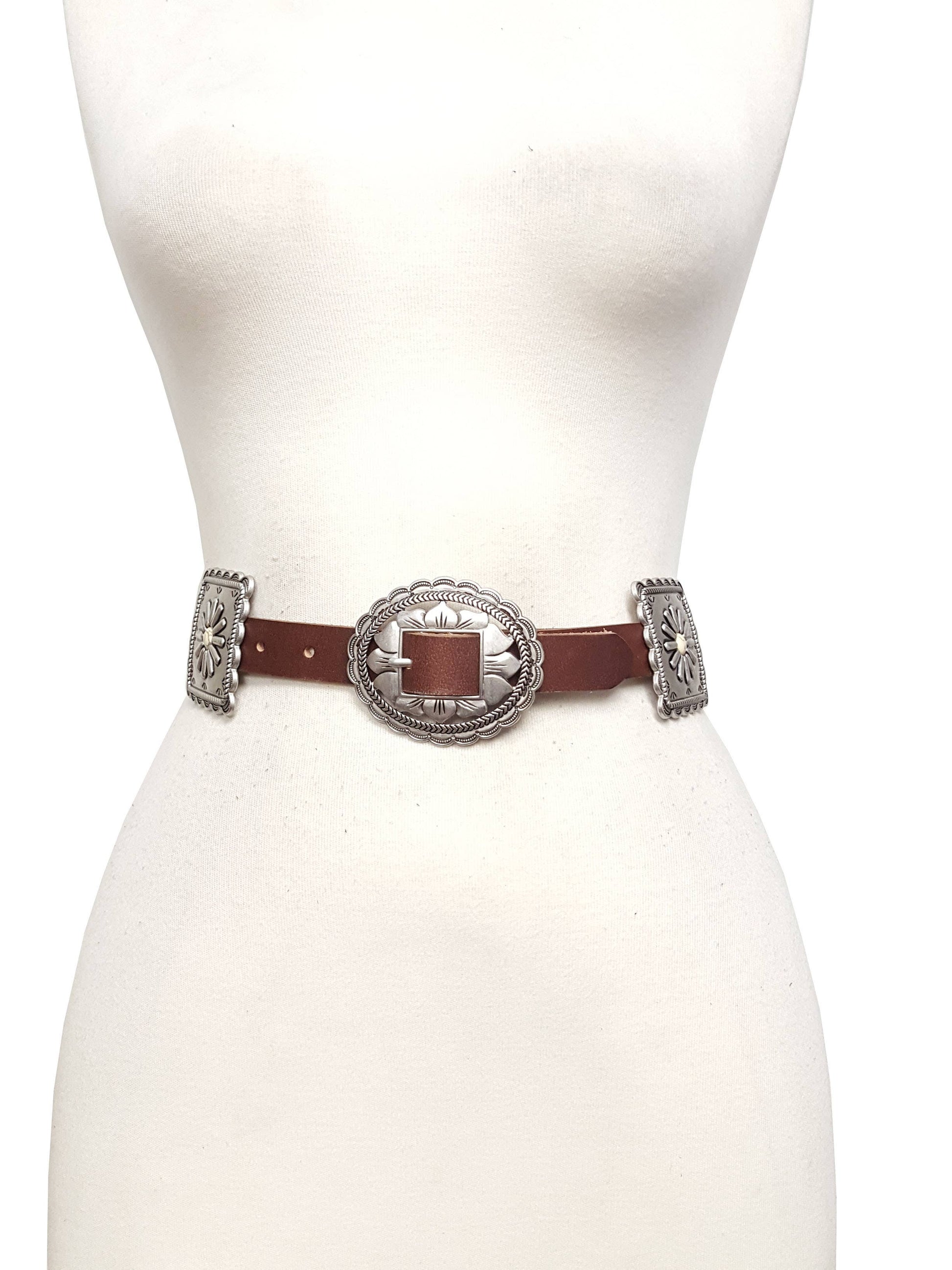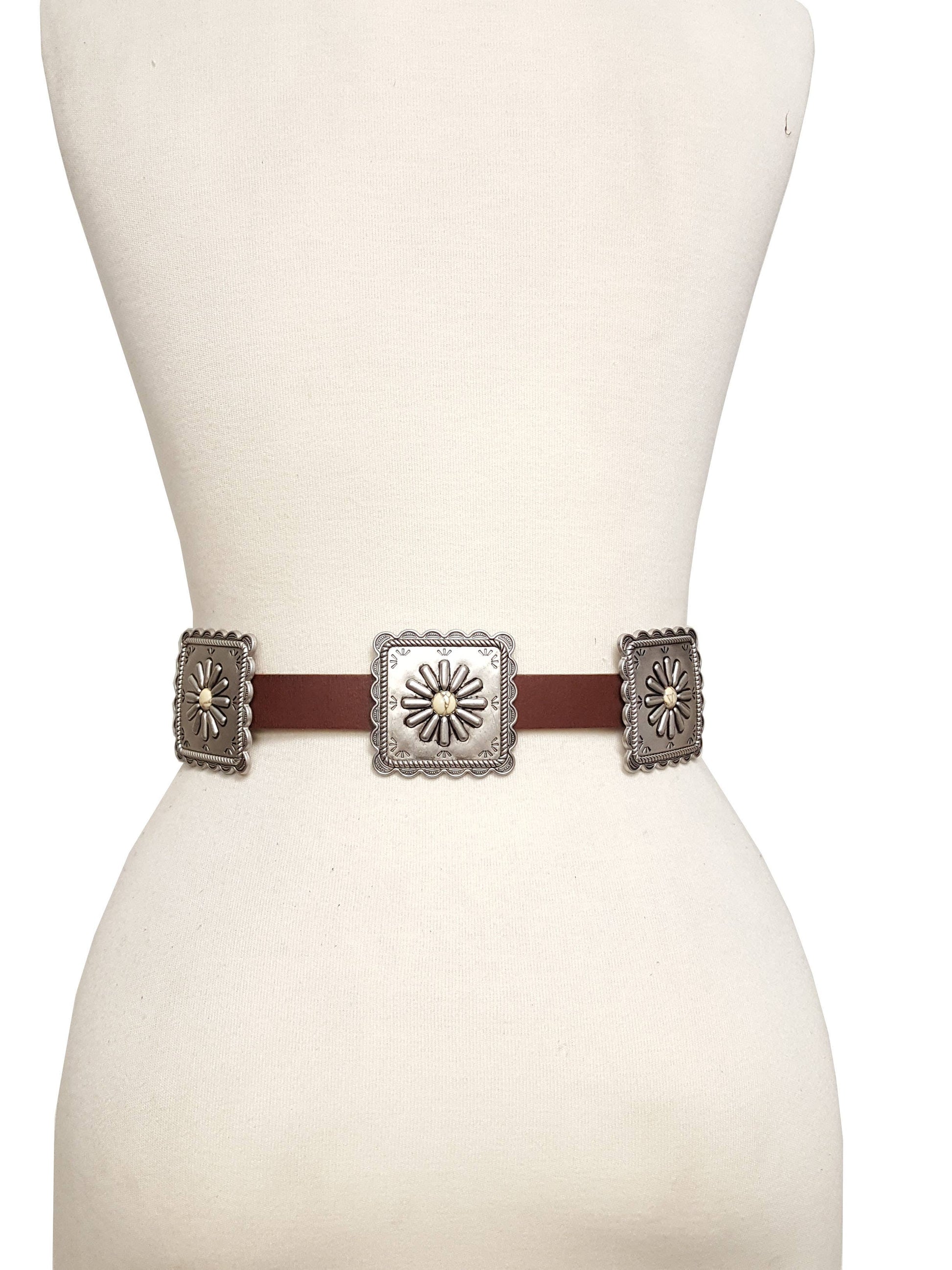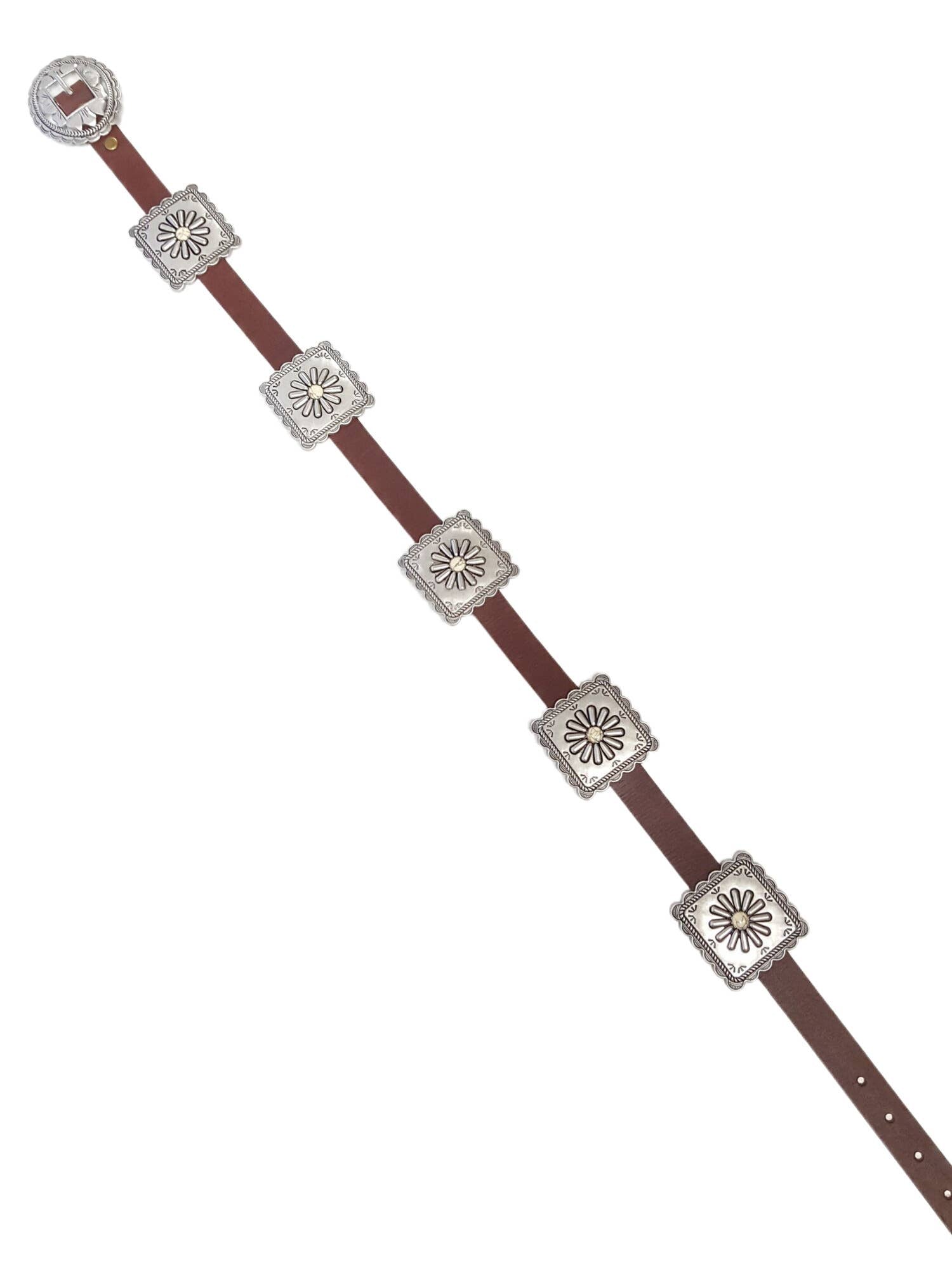 Western-Inspired Oval Floral Buckle. Square Conchos are sliding and can be adjust on any location of the strap. Concho dimension 2.5" x 2.5". Each belt has 5 sliding conchos.